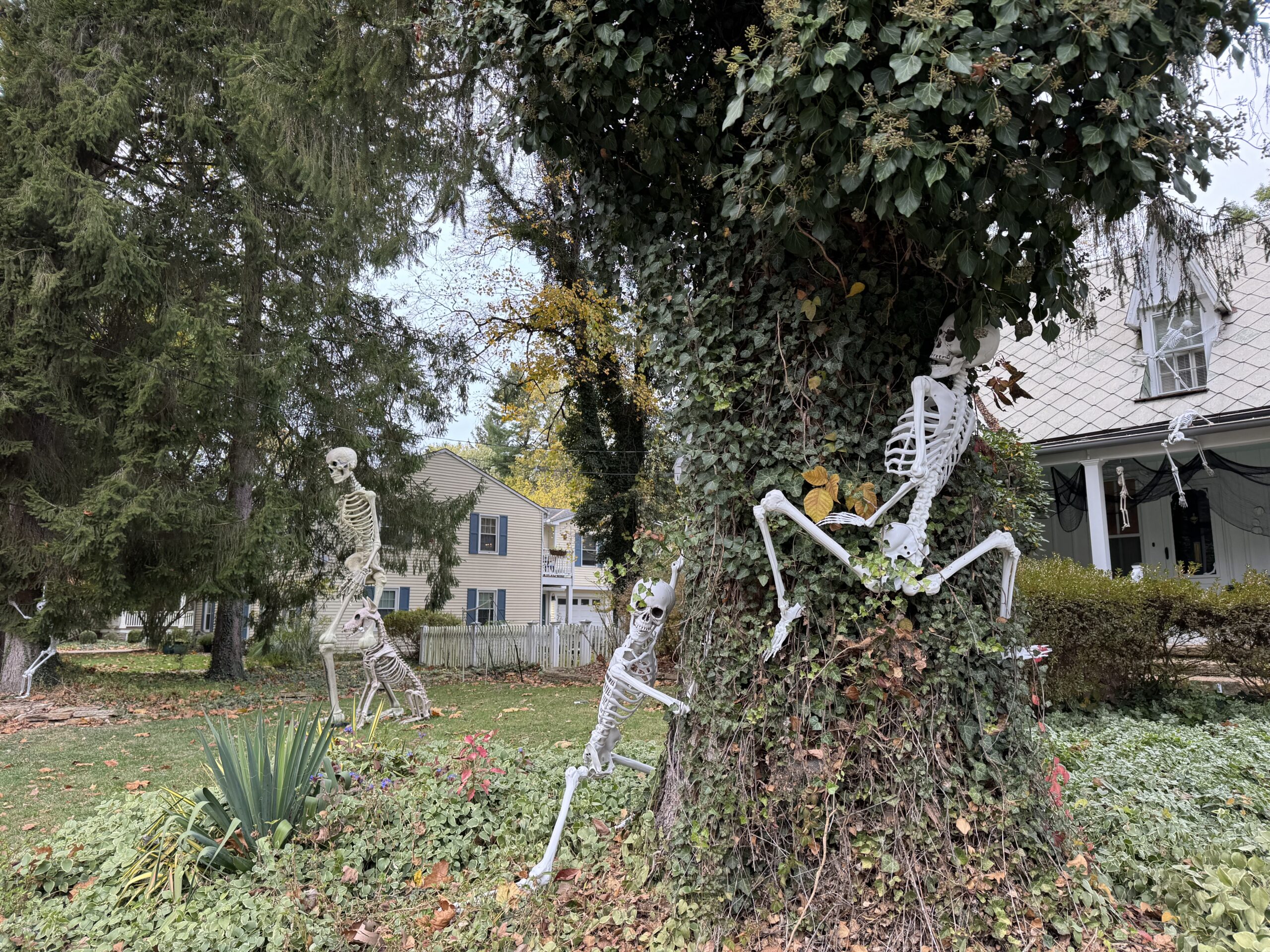 Every September, Bates enlists the help of a few local high school students to help her put up the decorations, as she’s afraid of heights. The group gets engrossed in the creative configurations of the skeletons to try and tell a story.