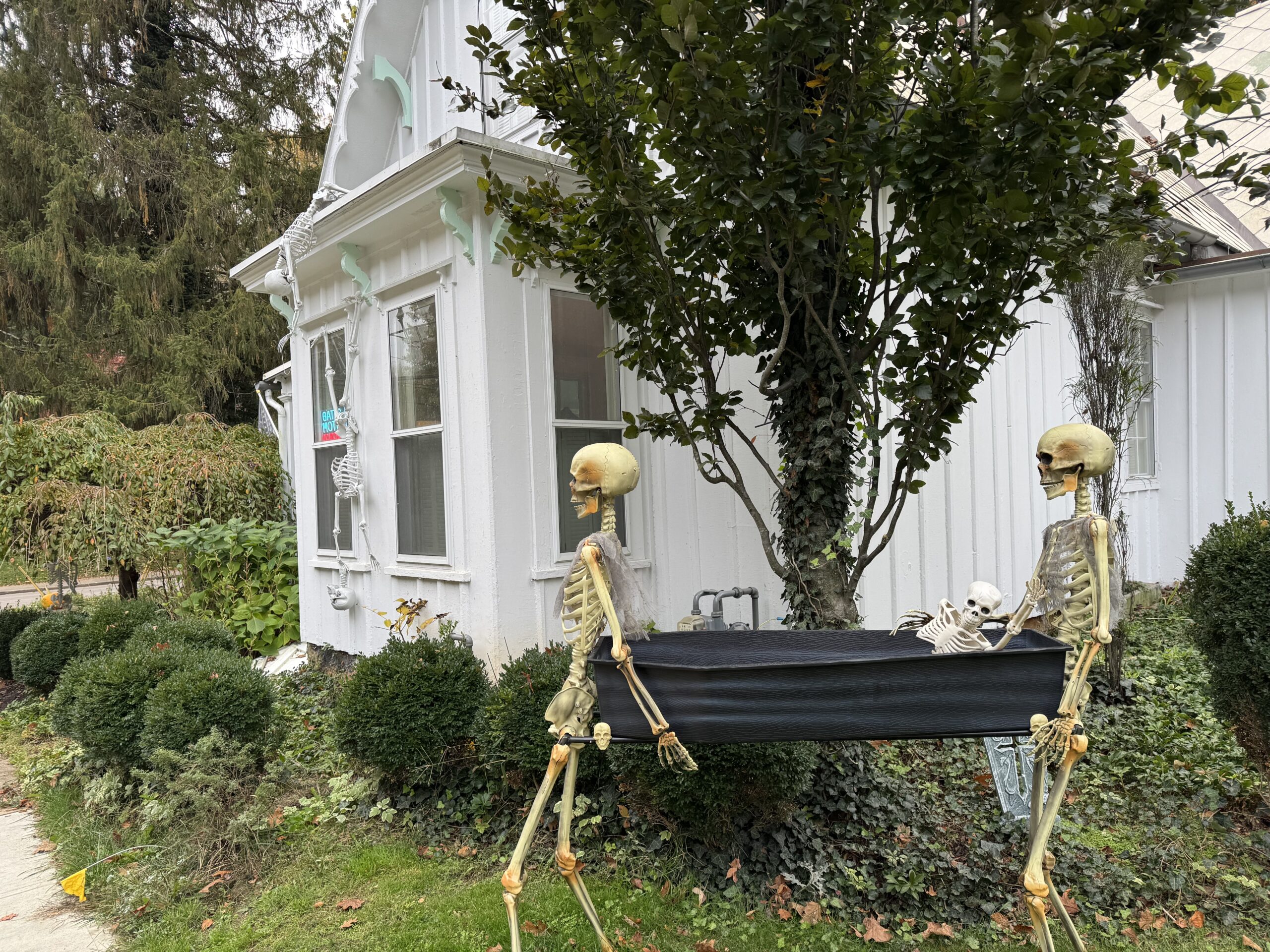 This year, a 12-foot-tall skeleton alongside his undead dog companion, with maybe their own bone in their mouth, stands guard over the white cottage home. Other skeletons scale the roof, porch columns and the property’s trees, attempting to get through the windows. Others emerge from bushes or carry their own coffins toward the front porch.