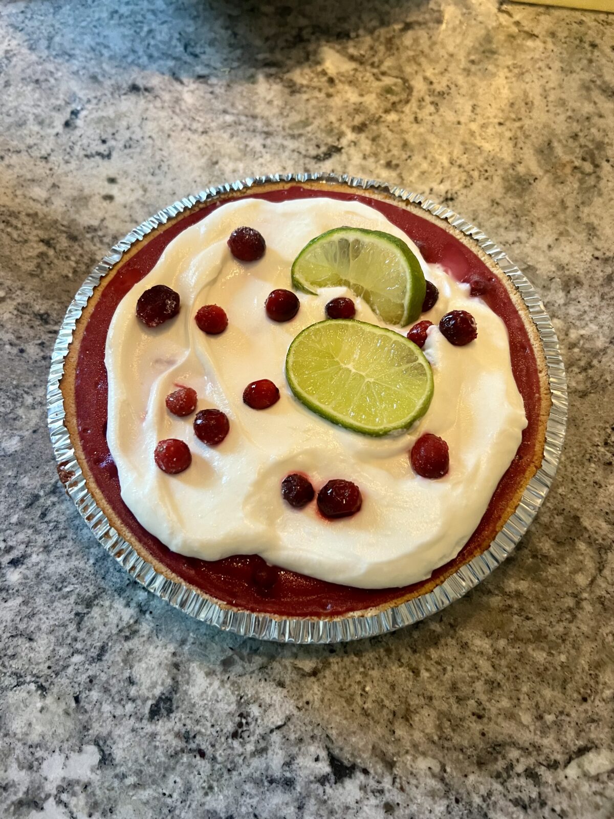 A week later, I came home for Thanksgiving. He walked through the door with the prettiest pie I have ever seen. It’s decorated with whipped cream, lime slices, and sugared cranberries.
