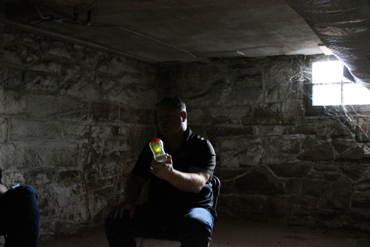 The ghosts don’t seem to be biting much in the basement. The flashlights – which Taylor says ghosts often turn on and off to communicate – lay dormant, though the EMF reader continues to fluctuate. The little lights on it flash from the baseline green to the middle yellow range. This could be some disturbance but according to Taylor, paranormal activity requires ongoing engagement. Spirits tend to be more responsive when people have been investigating more regularly. But no one has investigated Bryn Du for quite some time.