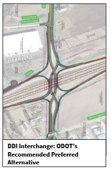 An ODOT fact sheet for the improvements says that the diverging diamond “moves traffic most efficiently through the interchange while minimizing the footprint and property impacts.”