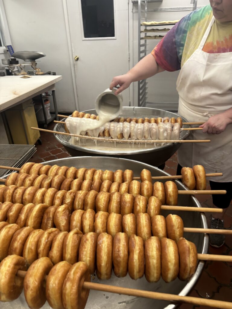 “I’ll take the whole stick,” a man says through the window separating the kitchen from the front counter, pointing to a wooden rod from which fresh donuts dangle. He takes another large bite of a donut Disbennett had given him.