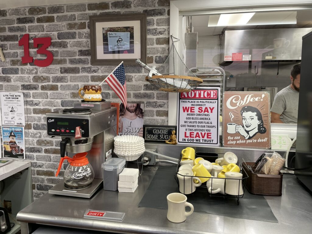 Next to the coffee pot, a sign shouts, “NOTICE” in big white letters on a red background. In smaller type, the sign announces, “This place is politically incorrect. We say Merry Christmas, God Bless America. We salute our flag and give thanks to our troops…” The remainder of the sign’s message on this day is obscured by a rack stacked full of yellow and white coffee mugs for use by counter customers.