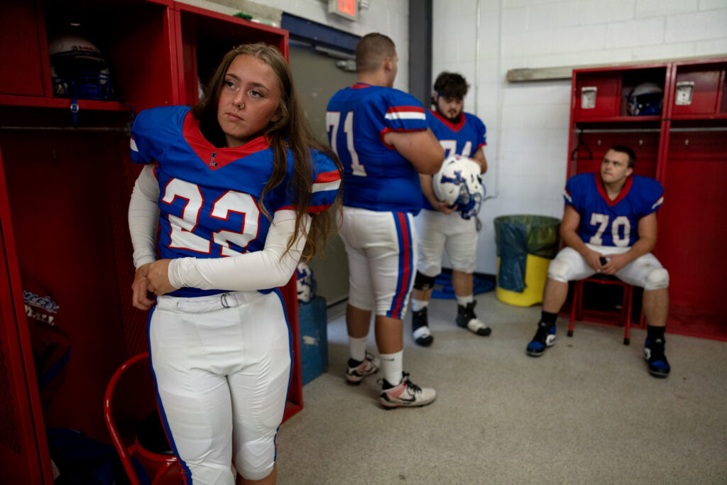 Abby Baker adjusts her uniform in the team locker room ahead of Lakewood’s final home game against Newark Catholic, Oct 17, 2025. The lancers lost to Newark Catholic 14-28.