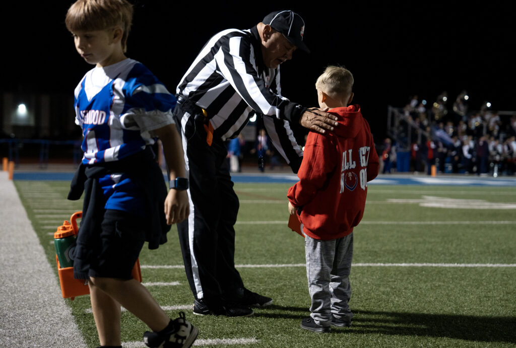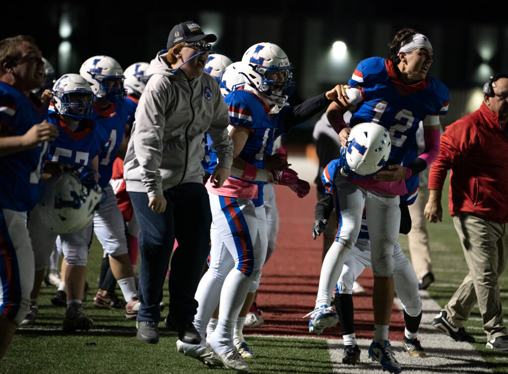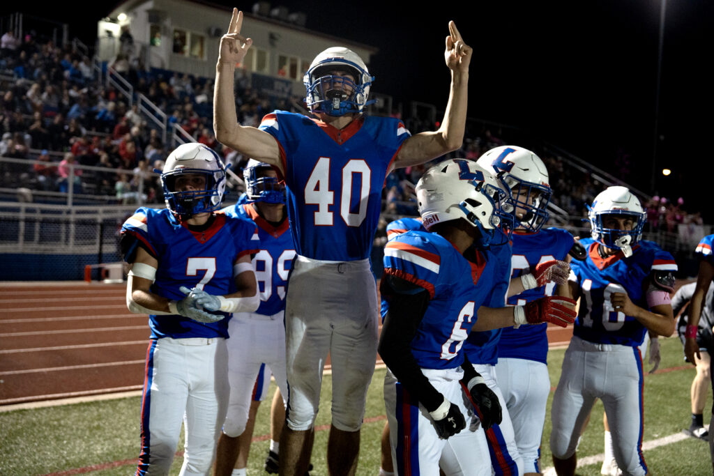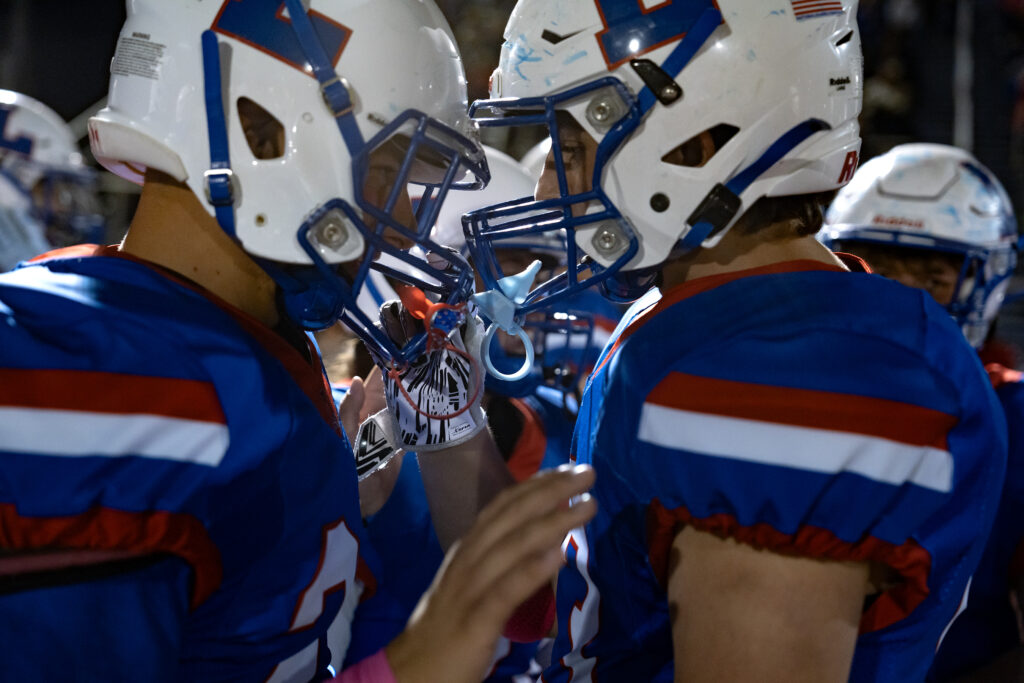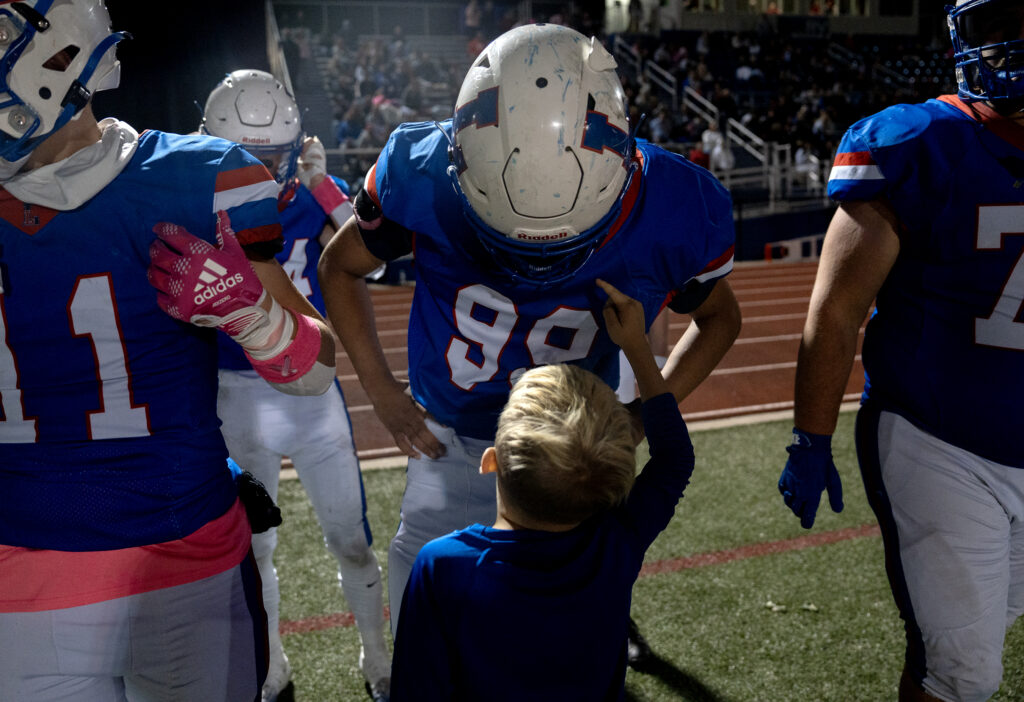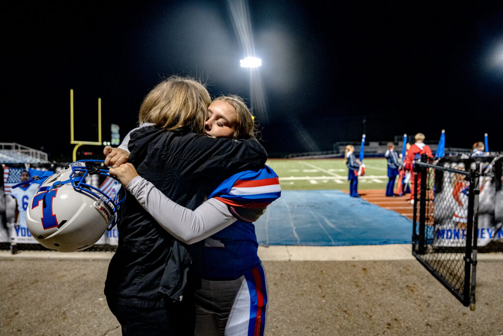 Abby Baker is embraced by her mom, Alissa, after walking off the Lancers’ football field for the final time. Baker who is a senior, played her final home game as kicker for the football team, Oct 17, 2025.