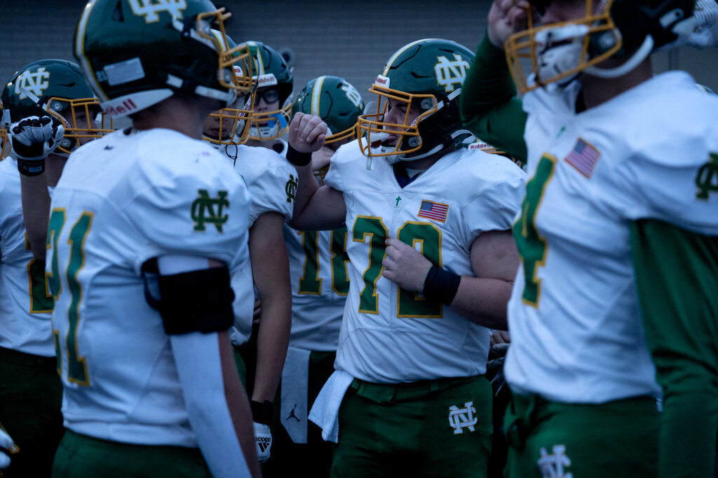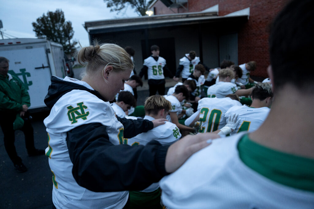 Newark Catholic offensive lineman, Pyper Basemann, prays with her team before their game against Lakewood. Newark Catholic won the game, 28-14.