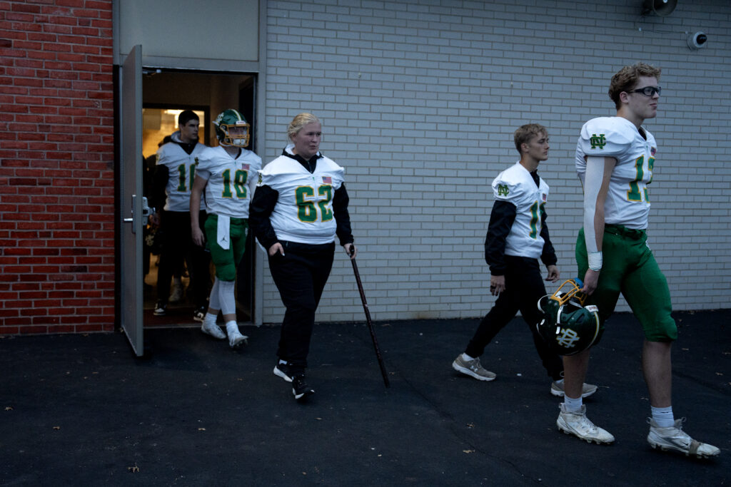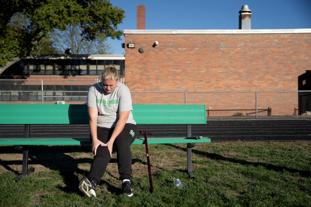 Newark Catholic offensive lineman, Pyper Basemann, rests her knee during practice at Newark Catholic High School, Oct 16, 2025. Basemann injured her ACL and is out for the remainder of the season. The sophomore remains optimistic she can return the following season, saying “at least I got my injury over with early.”