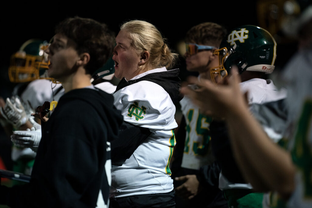 Pyper Basemann cheers on her team as they play against Lakewood, Cot 17, 2025. Newark Catholic beat Lakewood, 28-14.