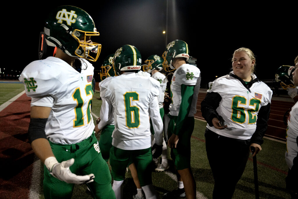 Pyper Basemann, an offensive lineman for Newark Catholic, talks with her coach, Josh Hendershot, while she waits for her male teammates to be get ready in the locker room ahead of their game against Lakewood. Basemann injured her ACL and is out for the remainder of the season.