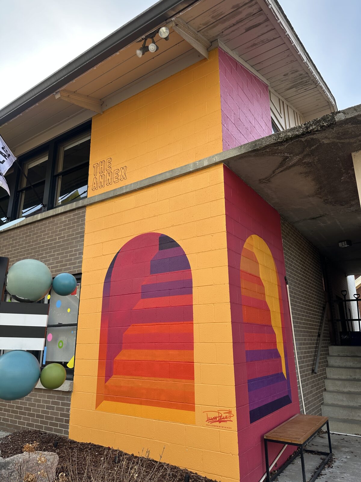 Bright shades of purple, yellow and orange blanket the corner of the annex in Granville, adding pops of color to an otherwise-brick building.