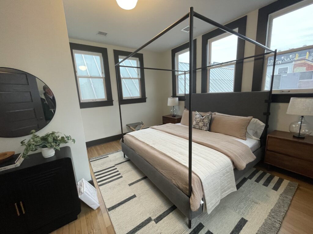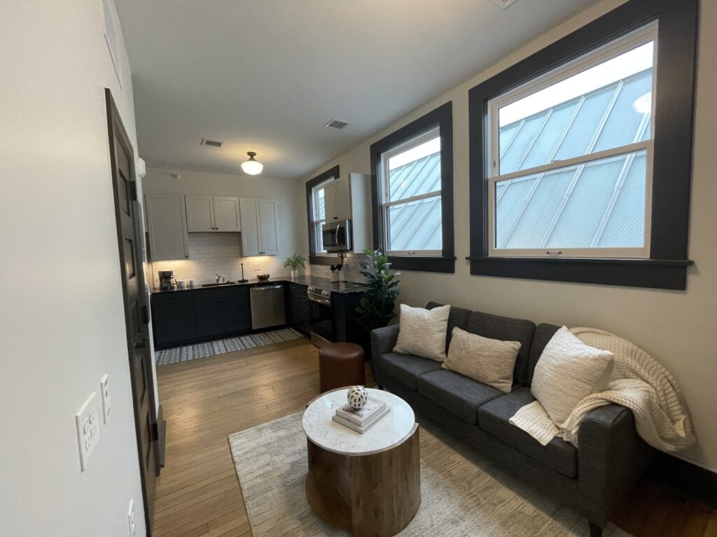 The loft apartments are one-bedroom, one-bathroom efficiencies, each with a kitchen and a living room. Many have original hardwood floors and other features retained from the original structure to maintain the historic character of the building.