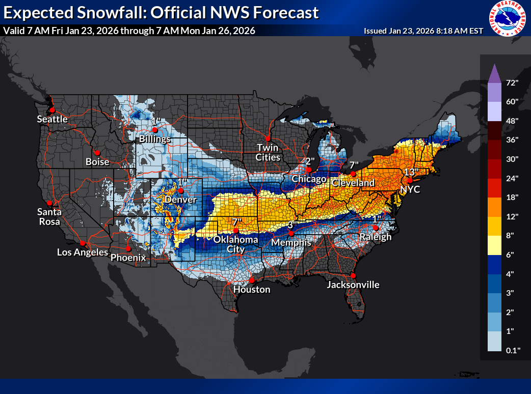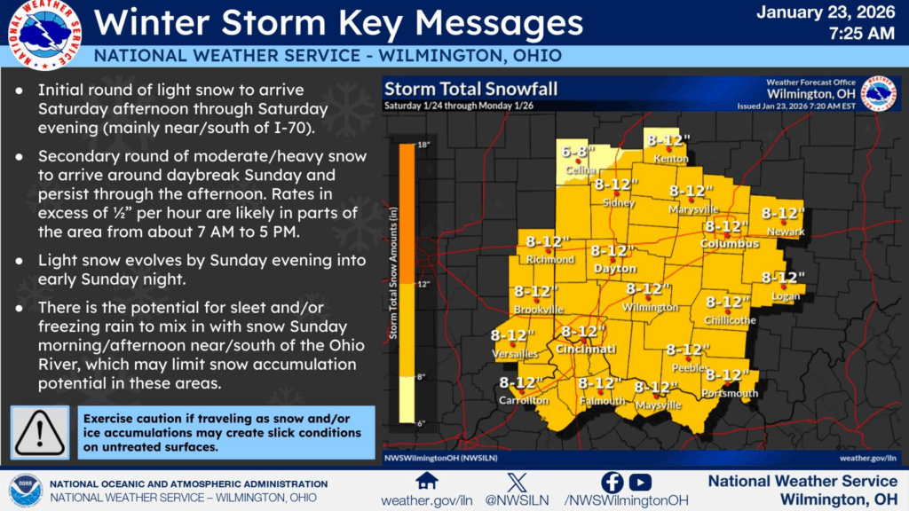 UPDATE, Jan. 23, 8:30 a.m.: The National Weather Service has issued a winter storm warning for central Ohio and most of the state and region. The forecast now says Licking County could see 8 to 12 inches of snow this weekend, with heavy snow beginning late Saturday and continuing throughout the day on Sunday.