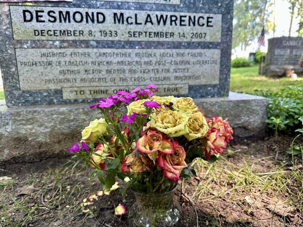 We cut through a residence hall to reach our final destination. The graveyard is about as long and wide as a football field. Trees much taller than the residence hall are scattered between and around tombstones. Desmond’s grave sits in the front row of them, furthest to our left.