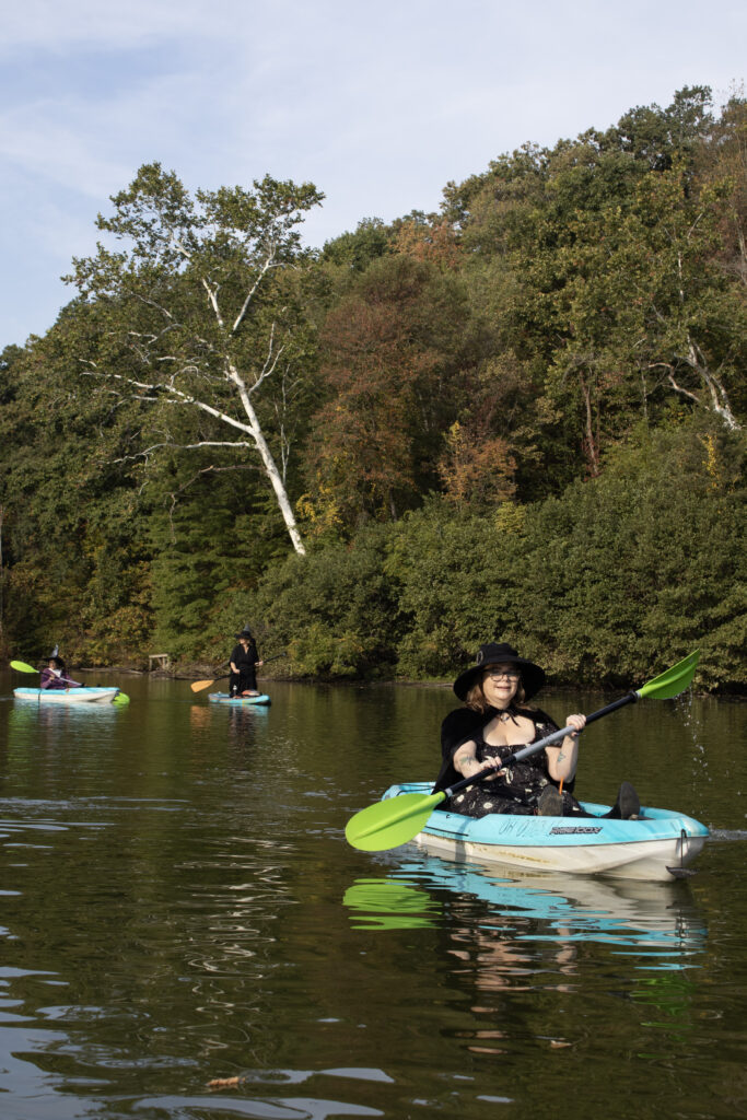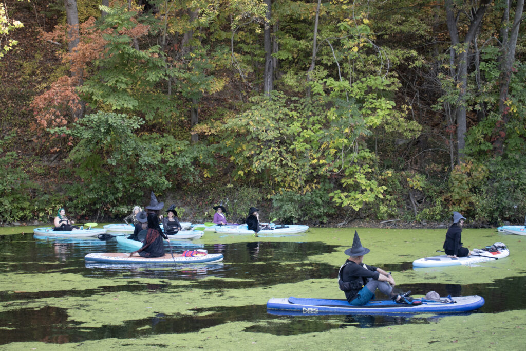 A thick layer of duckweed coats the water, stirred by the rhythmic rowing of kayakers and paddle boarders. Morning light streams through tall trees, illuminating a bobbing cluster of pointy black hats accompanied by quiet conversation and echoing cackles.