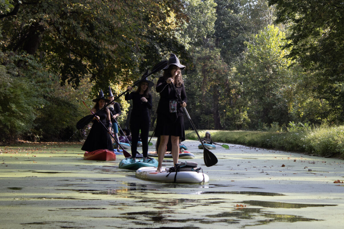 A thick layer of duckweed coats the water, stirred by the rhythmic rowing of kayakers and paddle boarders. Morning light streams through tall trees, illuminating a bobbing cluster of pointy black hats accompanied by quiet conversation and echoing cackles.
